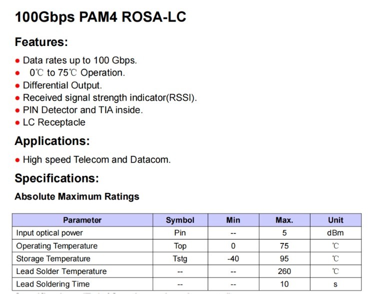 100Gbps 1310nm ROSA PAM4 ROSA-LC Transmitter Optical Subassembly