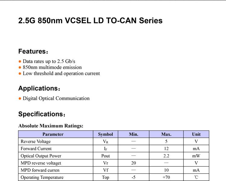 2.5G 850nm VCSEL LD TO-CAN Series Laser diode