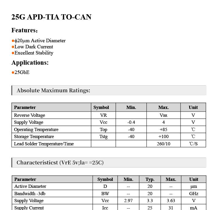 25G APD-TIA TO-CAN photodiode