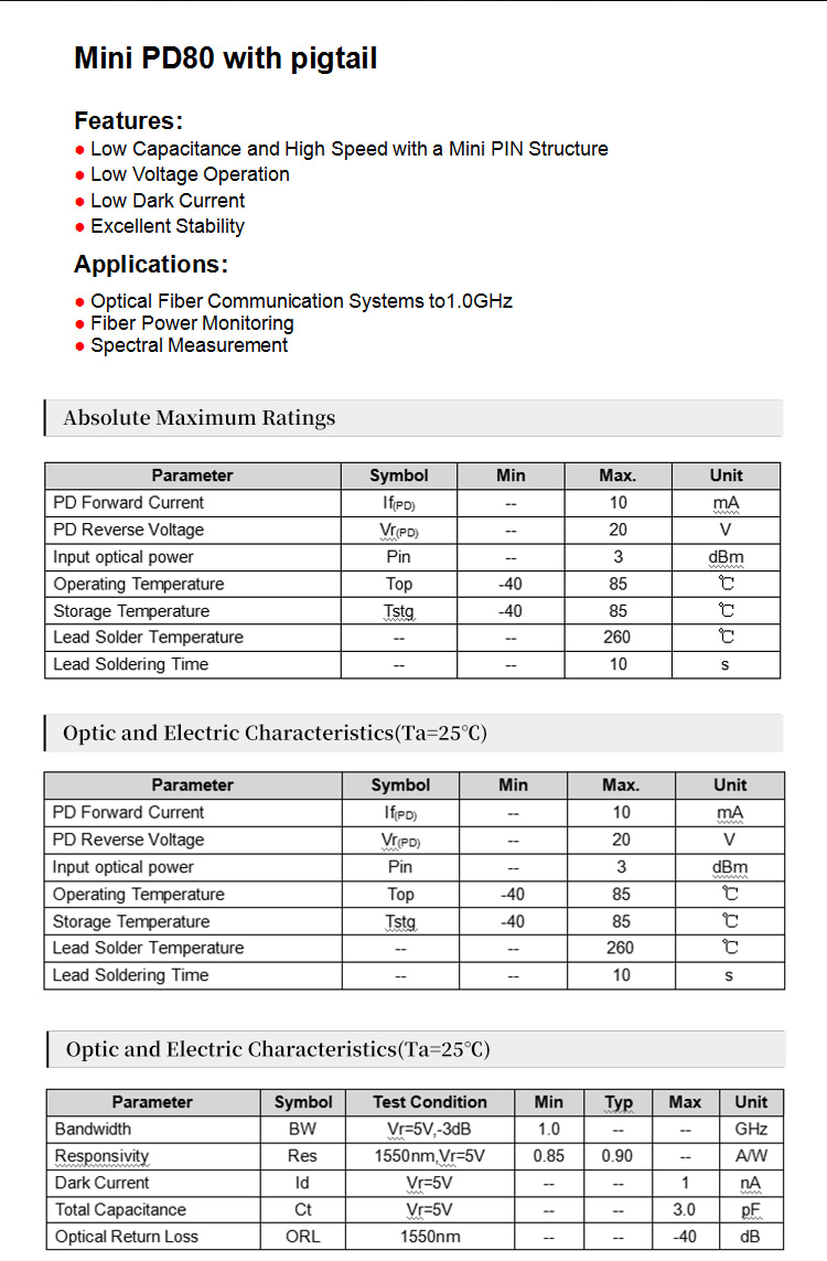 ● Low Capacitance and High Speed with a Mini PIN Structure